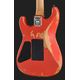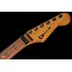 Erle für den Korpus und ein Hals aus Ahorn sind die Zutaten, aus denen diese Charvel gefertigt wurde. Für ein bequemes Spielgefühl wurde der Hals mit einem Compound-Radius-Griffbrett versehen, die Wölbung variiert von 12“ am ersten bis zu flacheren 16“ am zwölften Bund des Griffbretts, das aus Pau Ferro besteht und mit 22 Jumbo-Bünden bestückt ist. Was wäre eine echte “Super-Strat” ohne Vibrato? Die Charvel besitzt natürlich ein solches in Form eines Floyd Rose, das auch Dive-Bombs gelassen nimmt. Das System wurde, wie die komplette Hardware, schwarz lackiert, was zusammen mit dem Distressed-Finish und dem noch übrig gebliebenen orangenen Lack des Korpus einen coolen Look erzeugt. Mit viel Power geht es beim Klang zu, denn der Seymour Duncan Distortion JB TB-4 am Steg erzeugt zusammen mit dem Duncan '59 SH-1N am Hals ein breites Klangspektrum, das von sahnig-süß bis richtig böse reicht!
