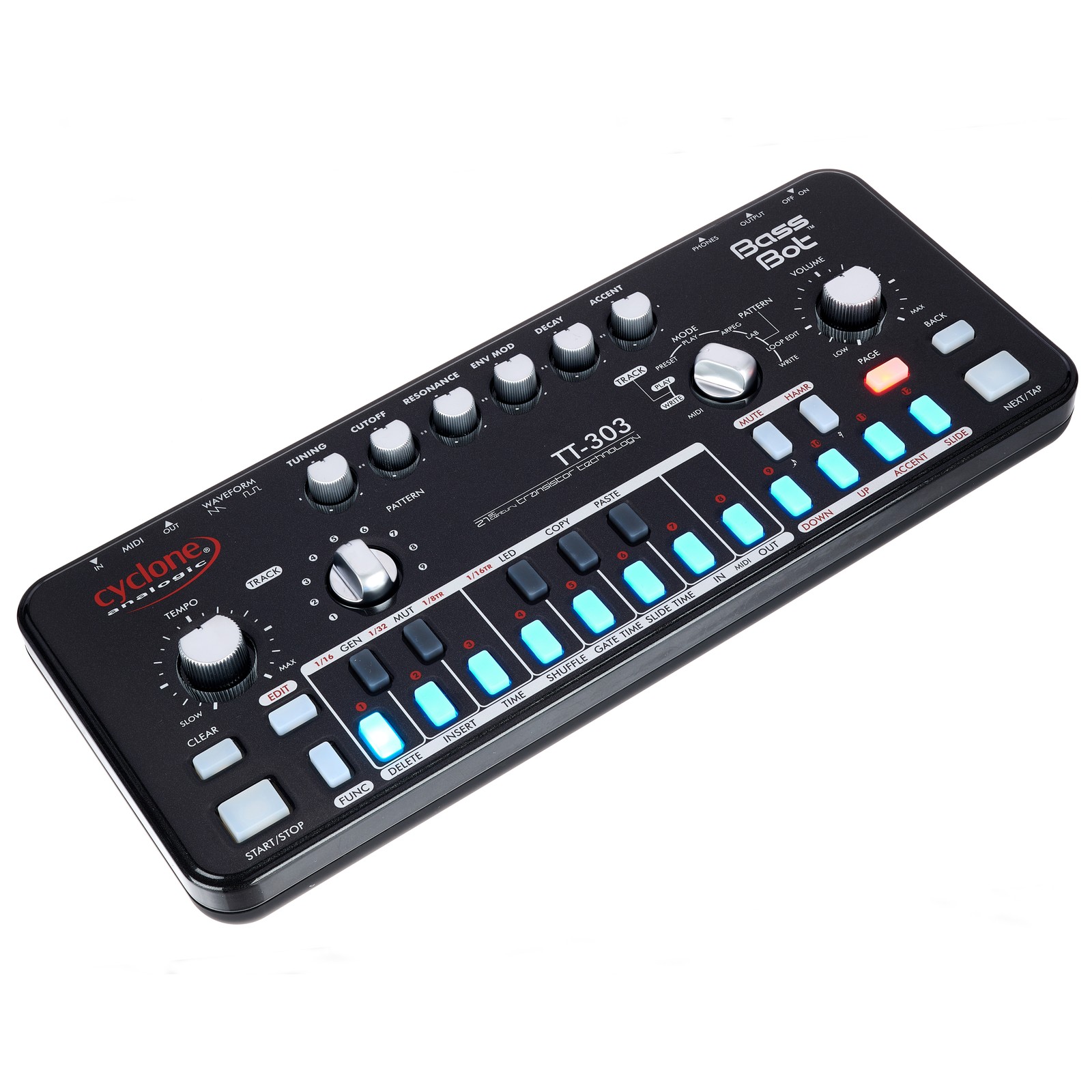 Der monophone Cyclone Analogic TT-303 bietet die klassischen Wellenformen Rechteck und Sägezahn sowie auch viele neue Funktionen, mit denen Patterns variiert und gestaltet werden können. Mit seinem warmen und groovigen Klang eignet er sich perfekt für Acid-Basslines. Der typische, zwitschernde, kreischende Acid-Sound lebt von einer hoch eingestellten Resonanz des Filters und weiteren extremen Konfigurationen. Dafür ist der TT-303 des französischen Herstellers Cyclone Analogic dank Funktionen wie Slide, Gate und Mute/Hammer wie geschaffen. Er ist in einem eleganten und modernen Design gehalten. Diese limitierte Edition kommt in einem schwarzen Gehäuse. Die Benutzeroberfläche ist dank der farbigen LEDs übersichtlich, und die Regler sind von der Handhabung her angenehm gestaltet.