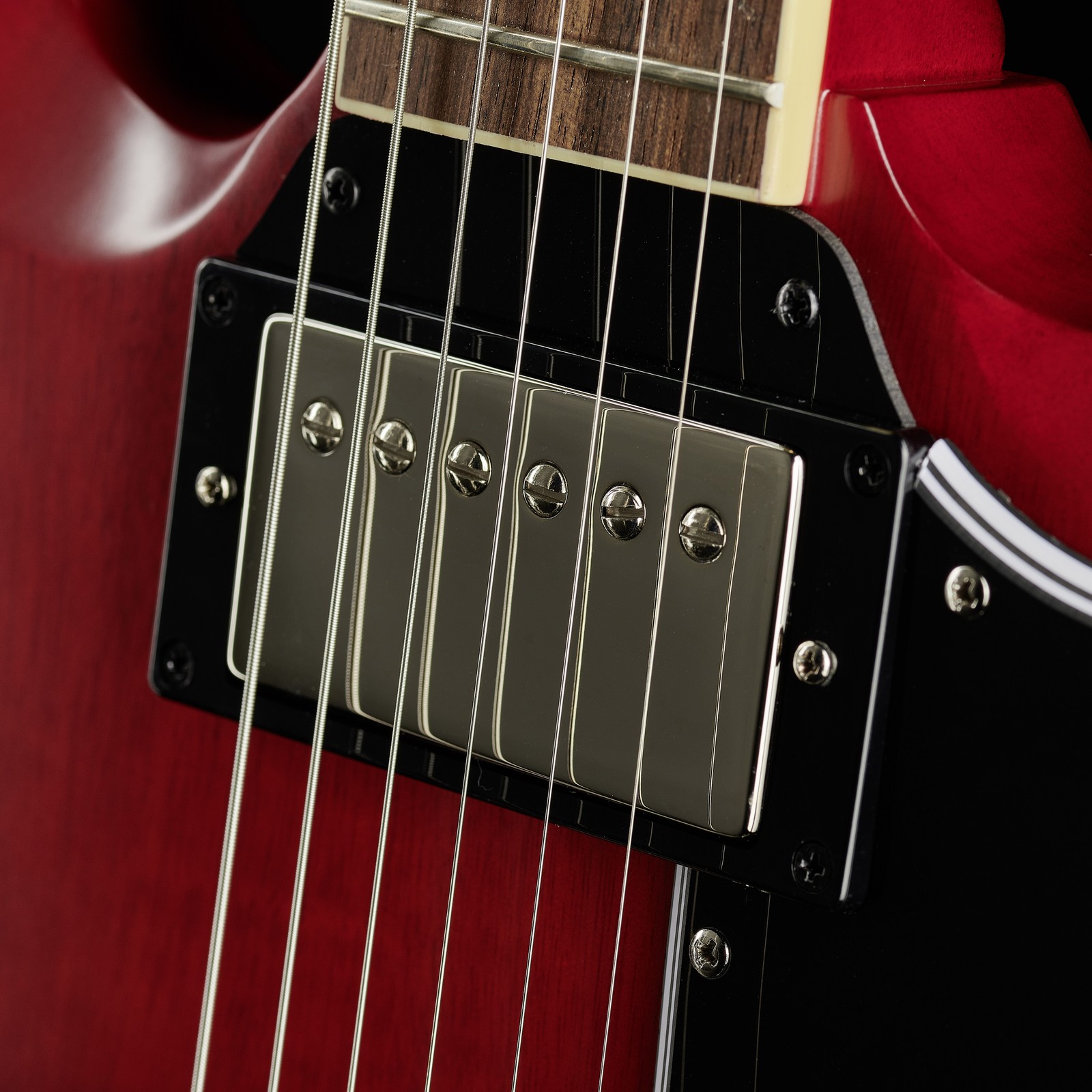 Mit der 1961 Les Paul SG Standard CH präsentiert Epiphone eine günstige Wiederauflage der erstmals im Jahr 1961 erschienenen und mittlerweile legendären Gibson-Solidbody. Nur für eine kurze Zeit trug die unverkennbare Double-Cut damals den Namen „Les Paul“, ehe sie kurz darauf unter der Bezeichnung „SG“ erfolgreich wurde. Entwickelt in Zusammenarbeit mit dem Gibson-Custom-Shop, setzt die 1961 Les Paul SG Standard CH diese Tradition nun fort. Sie bietet mit ihrer Mahagonikonstruktion und den zwei Gibson-Burstbucker-Pickups den kraftvollen Klang, der die SG so berühmt gemacht hat. Zuverlässig zeigt sich die Hardware mit dem Tune-O-Matic-Steg und dem Lock Tone Stop Bar. Die sechs Deluxe-Mechaniken an der Kopfplatte halten die Stimmung zusammen mit Graph-Tech-Sattel zuverlässig und sorgen für eine saubere Intonation auf dem Griffbrett. Außerdem ist erwähnenswert, dass bei dem für eine Epiphone gehobenen Preis neben der hochwertigen Hardware auch direkt ein Koffer mit dabei ist.