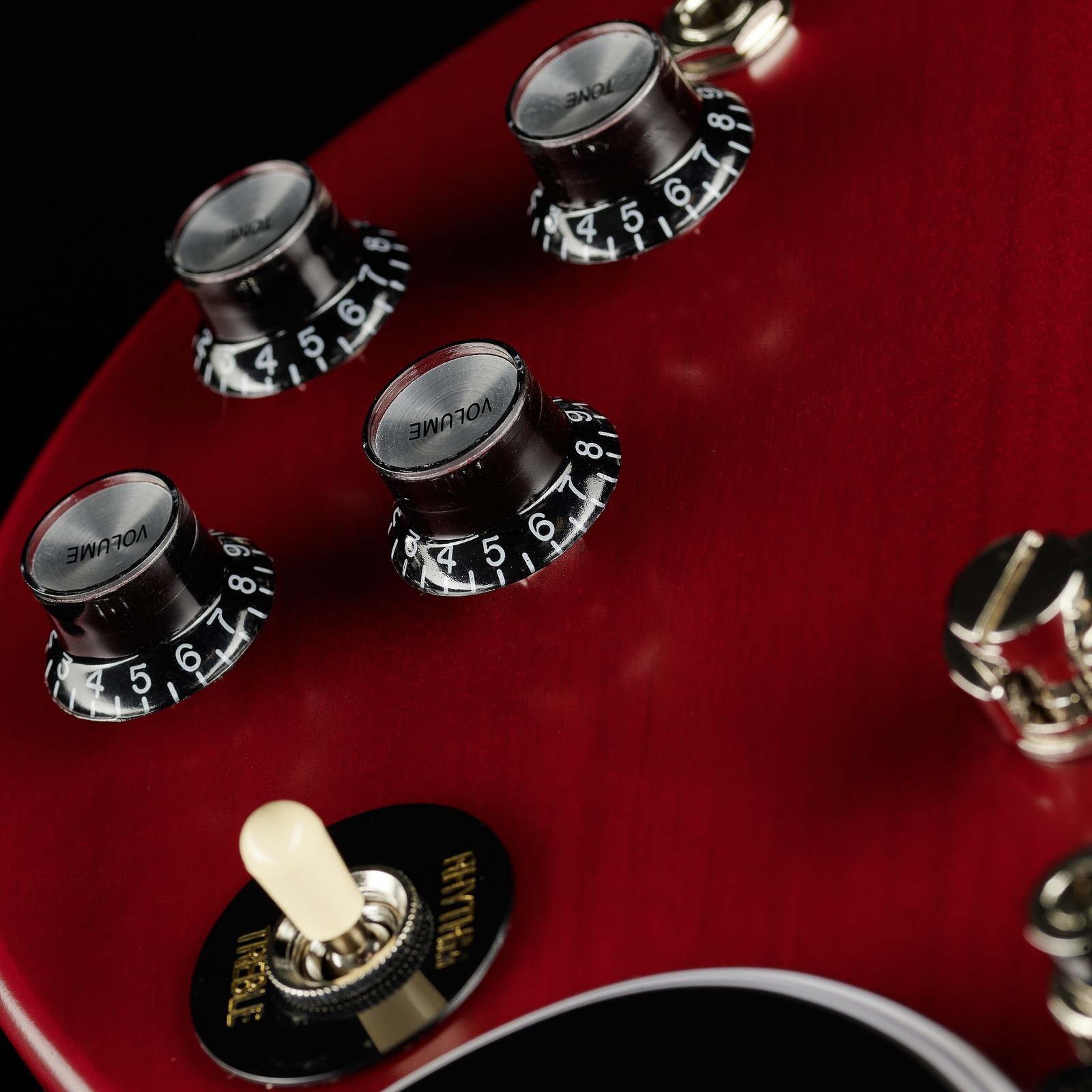 Die Kombination aus Mahagonikorpus und eingeleimtem Mahagonihals bildet die Basis für den durchsetzungsfähigen Klang der SG, von dem natürlich auch die 1961 Les Paul SG Standard profitiert. Das SlimTaper C Halsprofil ist angenehm schlank und lässt sich mit seinem Lorbeergriffbrett und dem typisch schmalen Halsfuß komfortabel bespielen. Indessen liefern die beiden Gibson-Burstbucker-Tonabnehmer den charakteristischen Sound authentisch an den Amp. Wie gewohnt verfügen beide Pickups über ihren eigenen Regler für Lautstärke und Ton und werden von einem Dreiwegeschalter ausgewählt. Die CTS-Potis und Mallory-Kondensatoren halten die Signalqualität innerhalb der Schaltung gleichbleibend hoch, während mit einem Tune-O-Matic-Steg, dem Lock Tone Stop Bar und den Deluxe-Mechaniken jede Menge zuverlässiger Hardware verbaut wurde.