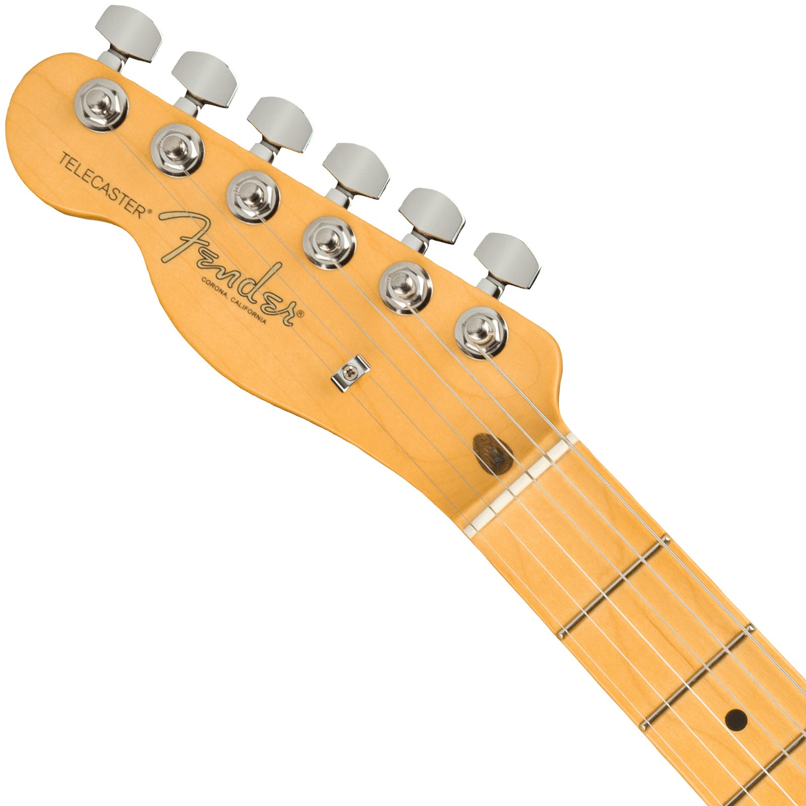 Bei den Pickups der AM Pro II Tele LH MN BTB handelt es sich um ein V-Mod II Set mit abgestimmten Single Coils für die Hals- und Stegposition. Telecasterüblich werden die PUs mit einem Drei-Wege-Schalter angewählt. Beim Volume-Poti handelt es sich um ein Push/Pull-Poti, mit dem die Pickups in Reihe geschaltet werden können. So sind auch druckvolle Rocksounds möglich, was für eine Tele mit Single Coils eher unüblich ist. Die Telecaster Deluxe Bridge besitzt kompensierte Messingsaitenreiter, die die Intonation der Saiten deutlich verbessern. Die Saiten können durch die Bridge (Top Load) oder durch den Korpus (String-Thru) aufgezogen werden. Die abgerundete Griffbrettkante kommt denjenigen Gitarristen entgegen, die gerne mit dem Daumen über dem Griffbrett spielen. Der abgerundete Hals-Korpus-Übergang erleichtert das Spielen in den hohen Lagen.
