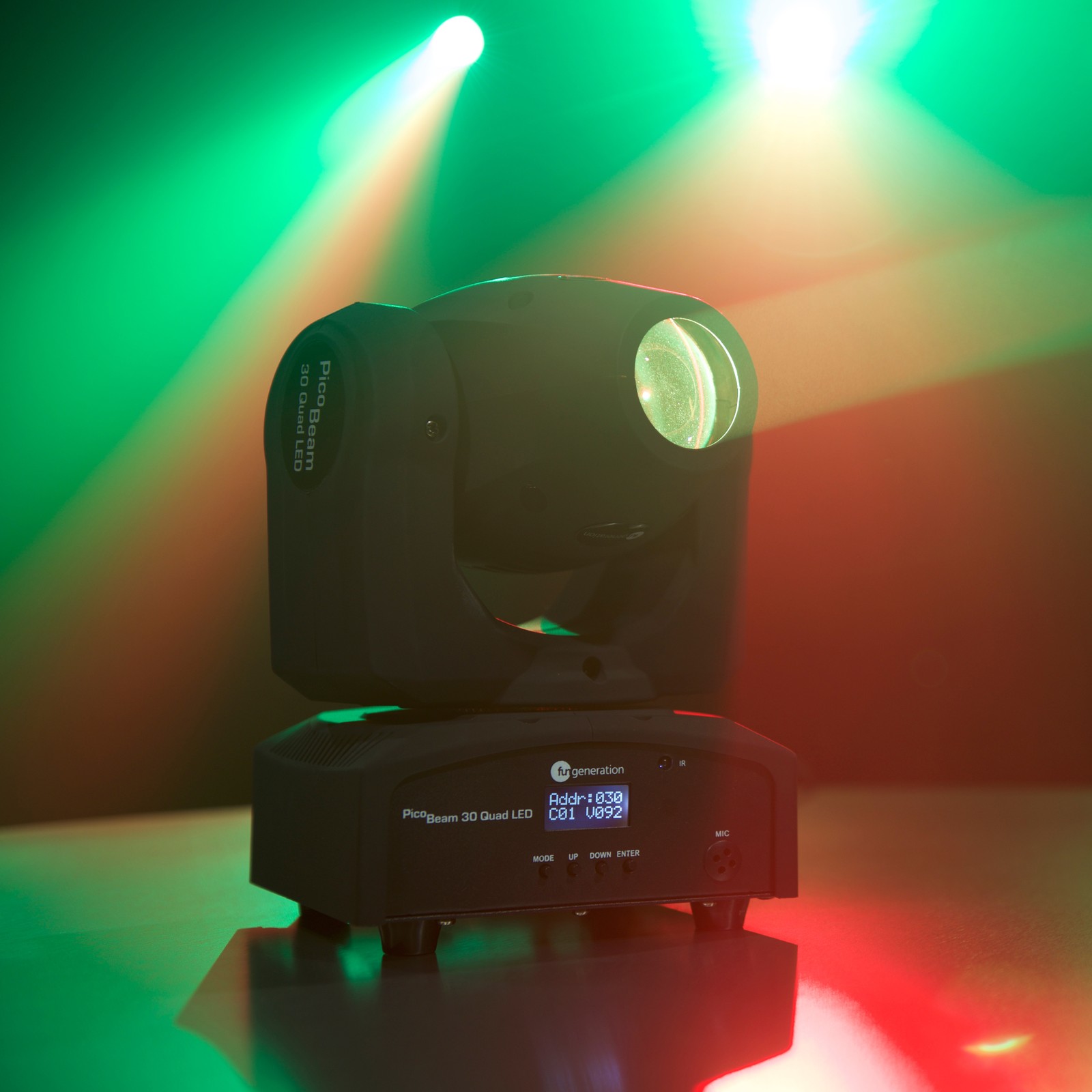 Der Fun Generation PicoBeam 30 Quad LED ist ein preisgünstiger Moving Head für Betreiber kleiner Locations, in denen bewegtes Licht gefragt ist. Gastronomen erhalten einen ein- oder zweifarbigen Beam, der abends durch den Gastraum dreht und mit einer einfachen Fernbedienung steuerbar ist. Betreiber von Fitnessstudios schaffen mit mehreren kreisenden Lichtkegeln auf einer kleinen abgedunkelten Trainingsfläche eine anregende Atmosphäre, in der Workout-Teilnehmer animiert werden, Energiereserven zu mobilisieren. Mit der Fernbedienung können die Coaches vier vorprogrammierte Lauflichter und die Musiksteuerung aufrufen. Wer den heimischen Partykeller in Rotation versetzen möchte und ein DMX-Pult zur Verfügung hat, kann eigene Szenen programmieren und durch Invertieren von Pan und Tilt spiegelverkehrte Bewegungen mehrerer dieser Moving Lights erzeugen.