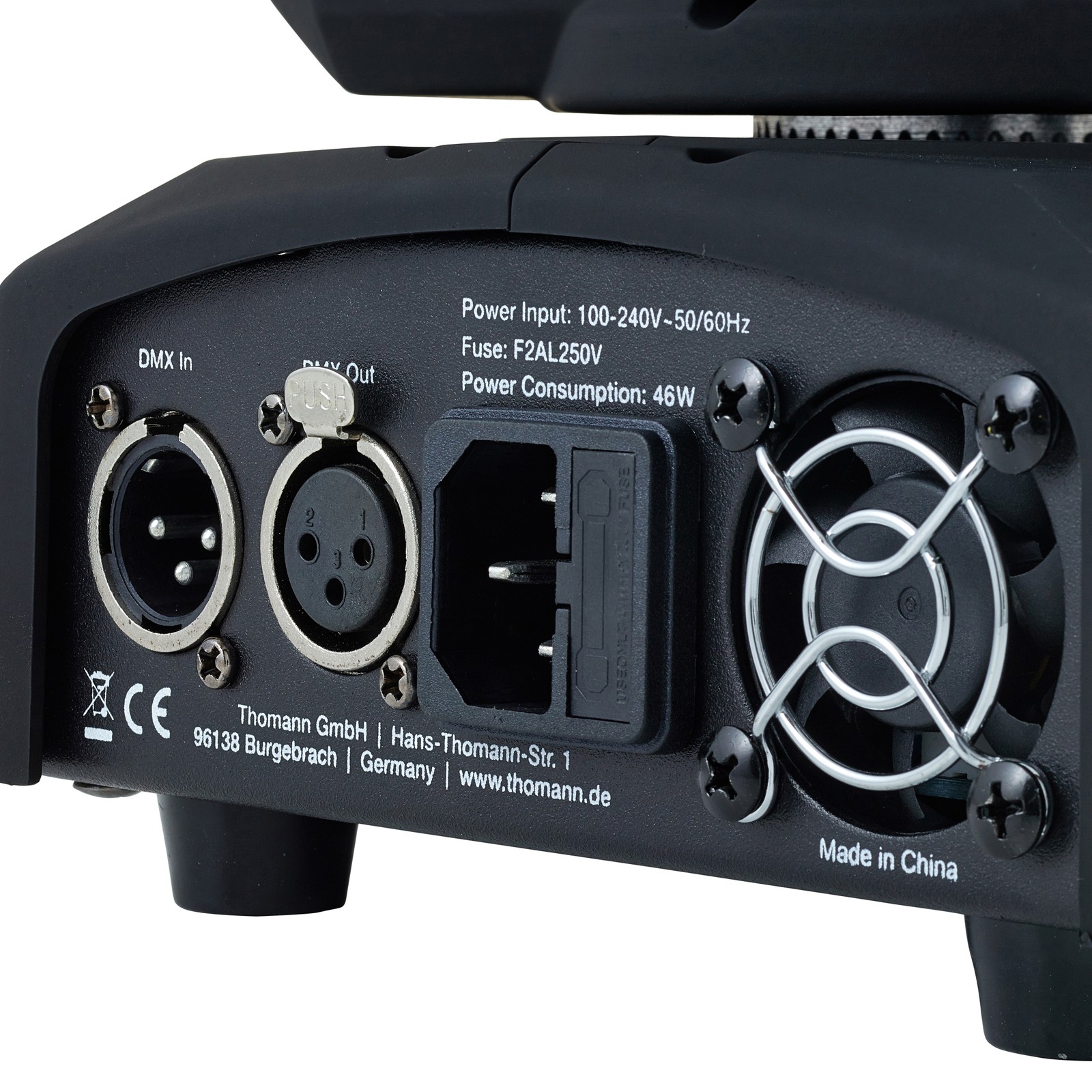 Im Zentrum des Fun Generation PicoBeam 30 Quad LED arbeitet eine 30 Watt starke High Performance RGBW Quad Colour-LED. In einem Abstrahlwinkel von nur 4° tritt ein enger Lichtstrahl aus. Dieser kann sich in der Waagerechten um 540° und in der Senkrechten um 230° drehen. Das bewegte Licht nimmt nur 46 Watt an Leistung auf und wiegt 3 kg. Es ist für den Einsatz in trockenen Innenräumen gemacht und kann aufgestellt oder mit dem beiliegenden Befestigungsbügel aufgehängt werden. Bedient wird das Moving Light entweder mit Tasten im Scheinwerfersockel, per DMX-Steuerung im 3-, 8- oder 13-Kanal-Modus oder mit der beiliegenden Fernbedienung. Hat diese Sichtverbindung zum entsprechenden Infrarotsensor rechts neben dem Display, können Grundfunktionen des Moving Lights quasi aus der Hosentasche gesteuert werden.