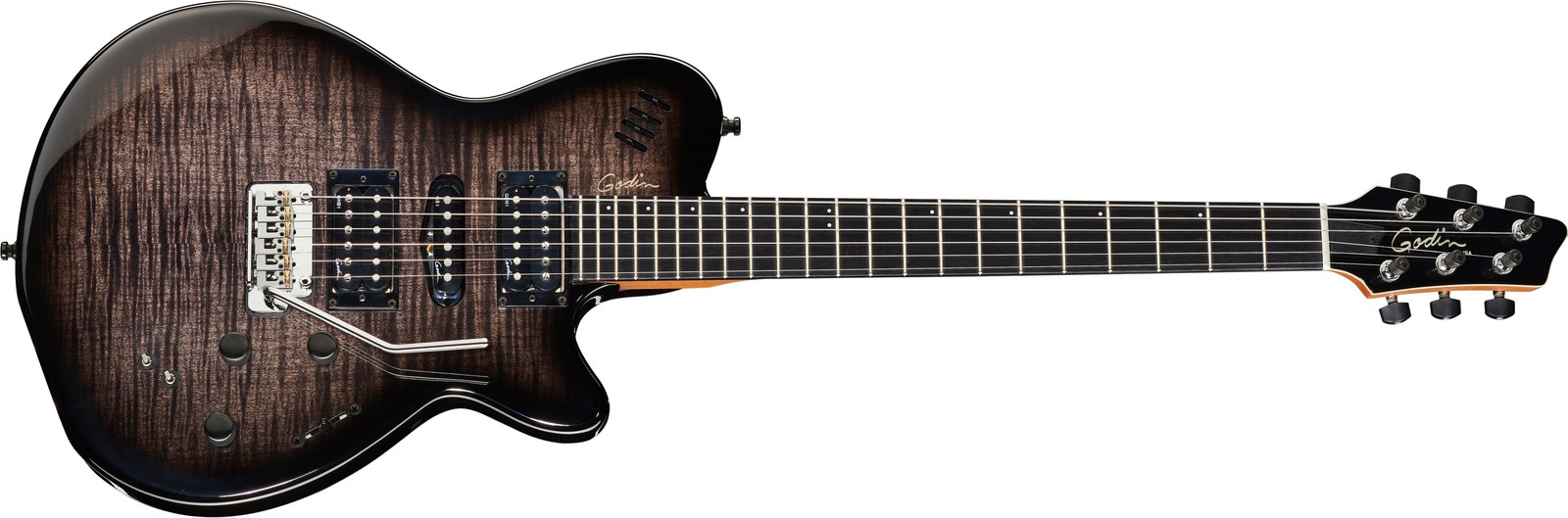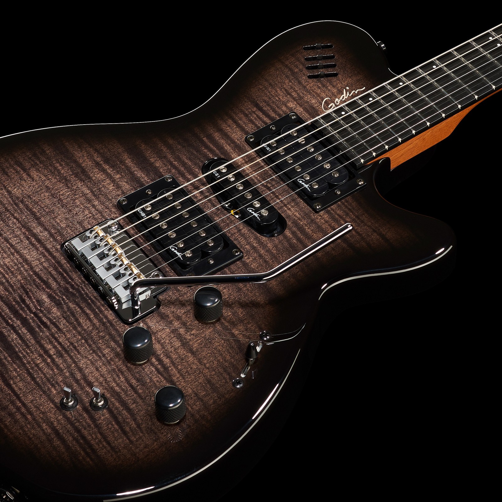 Der schlanke Korpus der Godin XTSA wurde aus Ahorn gefertigt, welches zusammen mit dem geriegelten Ahornfurnier im Transparent Black Finish einen klassischen Singlecut-Body darstellt. Die große Anzahl der Regler und Schalter auf der Decke lässt erahnen, dass hier im Inneren eine Menge Potenzial schlummert, und in der Tat stehen dem Benutzer drei Möglichkeiten zur Verfügung, seinem Spiel Ausdruck zu verleihen. Zunächst wäre da die Bestückung mit einer H-S-H Kombination zu nennen, um die klassischen E-Gitarren-Sounds von ganz sanft bis sehr heavy abzudecken. Weiterhin wurde mit den RMC-Transducer-Saitenreitern eine Möglichkeit geschaffen, die Klänge einer Westerngitarre möglichst naturgetreu nachzubilden. Und schließlich ermöglicht eine 13-polige Buchse den Anschluss eines Gitarrensynthesizers, wie etwa die Geräte der Roland GR-Serie. Das Mischen des Piezo-Sounds mit den drei magnetischen Pickups ist problemlos machbar, zudem gibt es für die akustischen Sounds einen Preamp mit Dreiband-EQ.