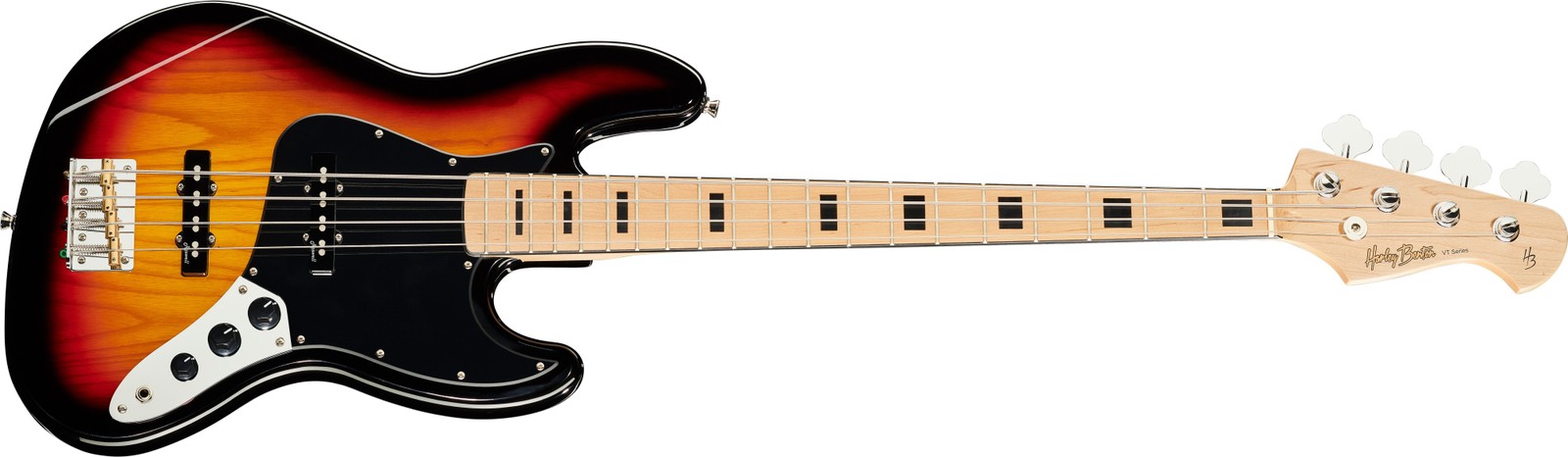 Ein Korpus aus amerikanischer Esche, ein Hals und Griffbrett aus kanadischem Ahorn mit 20 Bünden bilden die Basis des Harley Benton JB-75. Das Design mit dem Griffbrettbinding und den Block Inlays sorgen zusammen mit dem 3-Tone Sunburst Finish für den authentischen Vintage Look. Die Sattelbreite von 38 mm und das C-Profil des Halses bieten eine Bespielbarkeit, bei der man sich zu Hause fühlt. Ganz wie beim Vorbild handelt es sich um eine Schraubhalskonstruktion, was entsprechend Attack im Sound liefert. Zwei Roswell JBA AlNiCo-5 Vintage Single Coils und eine passive Elektronik mit den beiden Volume- und einem Tone-Regler bilden die klangliche Schaltzentrale des JB-75. In Kombination mit dem 3-Band-EQ und dem Kompressor des Harley Benton HB-20B sind bereits einige Soundoptionen möglich.