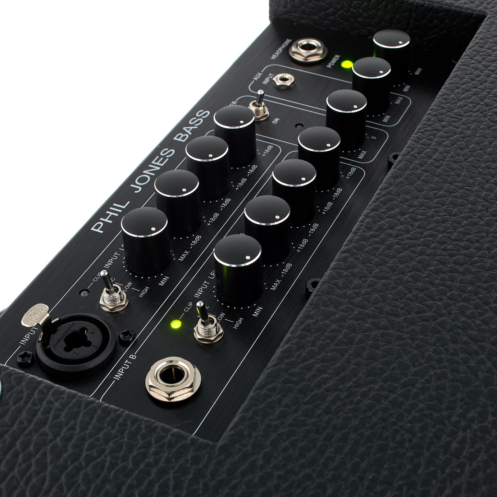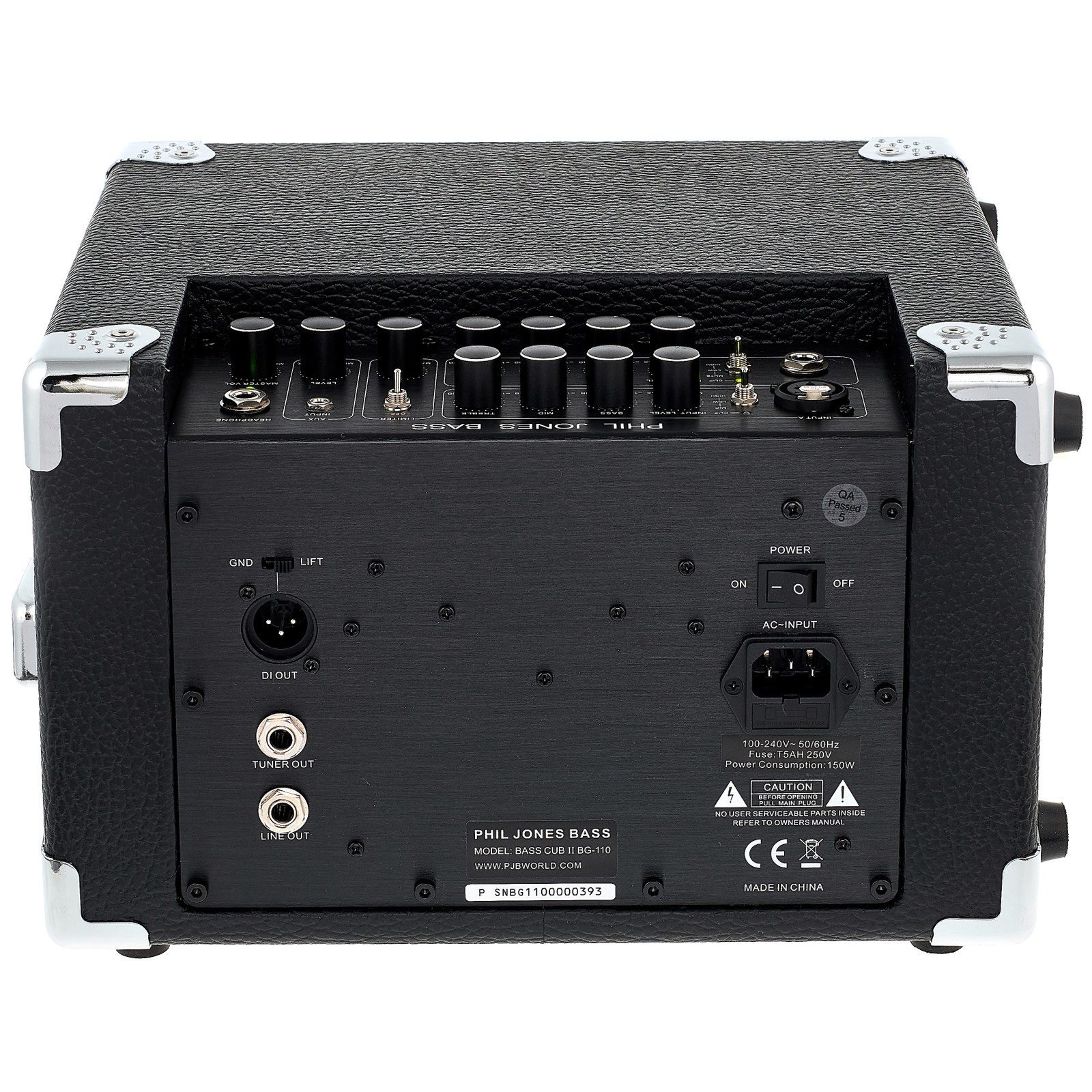 Das Alleinstellungsmerkmal aller Phil-Jones-Produkte sind die 5-Zoll-Lautsprecher, von denen zwei im BG-110 verbaut sind. In ihrer überarbeiteten „Chrome-Dome“ Version liefern sie einen extrem knackigen und sauberen Sound mit hoher Detailtreue. Angetrieben werden die Speaker von einer 110-Watt-Class-D-Endstufe, welche dank neuem laststabileren Netzteil noch mehr Punch liefert. Der BG-110 besitzt zwei identische Kanäle, welche beide über einen 3-Band-Equalizer verfügen (Bass, Mid, Treble). Kanal 1 besitzt eine Kombibuchse, die optional den Anschluss eines Mikrofons ermöglicht. Selbstredend kann man per Aux In eine externe Klangquelle mit dem BG-110 verbinden und der integrierte Kopfhörerverstärker erlaubt stilles Üben, ohne klangliche Abstriche machen zu müssen. Für Live- oder Recording-Situationen befindet sich auf der Rückseite des Phil Jones BG-110 ein hochwertiger D.I.-Ausgang.