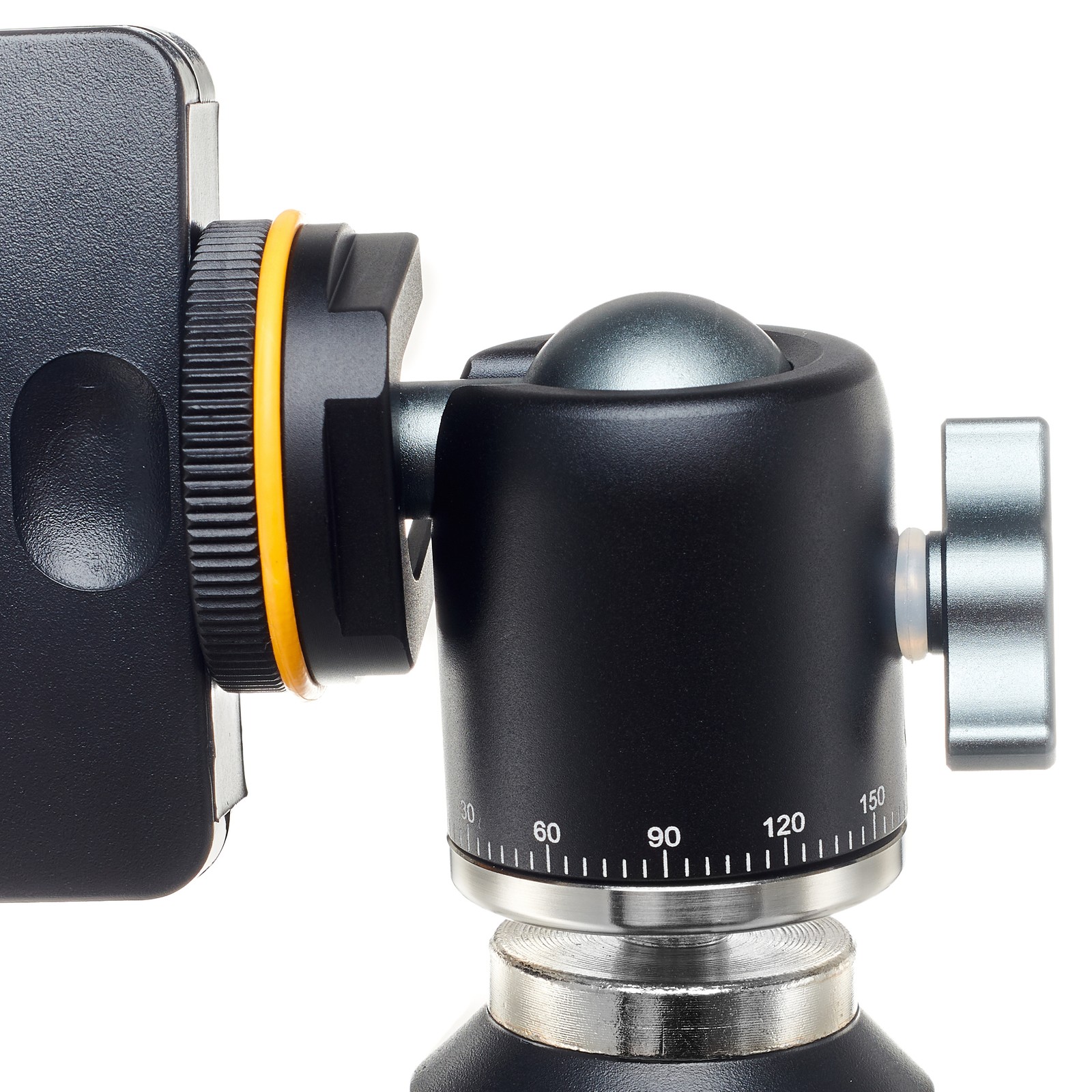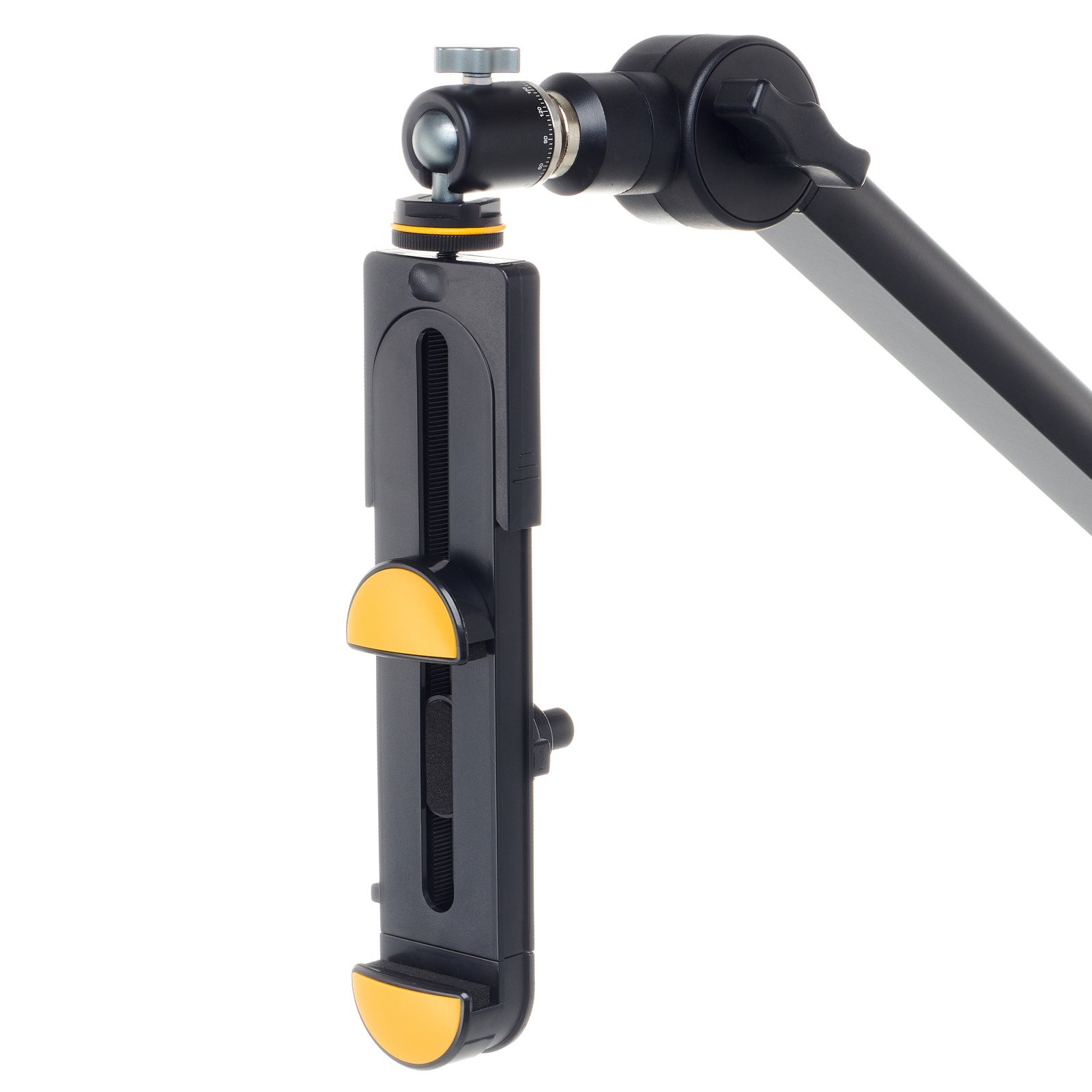 Der schwarz pulverbeschichtete Microphone Arm besteht aus einer robusten Aluminiumkonstruktion, die über drei feststellbare Drehpunkte gelenkt und von einem Federmechanismus unter Spannung gehalten wird. Das universelle Kugelgelenk namens „Universal Ball Joint“ kann zur Aufnahme von Mikrofonen, Kamerazubehör und Mobilgeräten verwendet werden und verfügt über ein 3/8“-Innen- und ein 1/4"-Außengewinde. Zudem ist es mit einem Blitzschuh-Profil-Adapter und einer 360-Grad-Skala mit zusätzlicher Fixierung ausgestattet. Die „Tablet Clamp“ ist eine ausziehbare Halterung für Mobilgeräte von 6 bis 27cm und wird über 1/4"-Innengewinde am Kugelgelenk montiert.