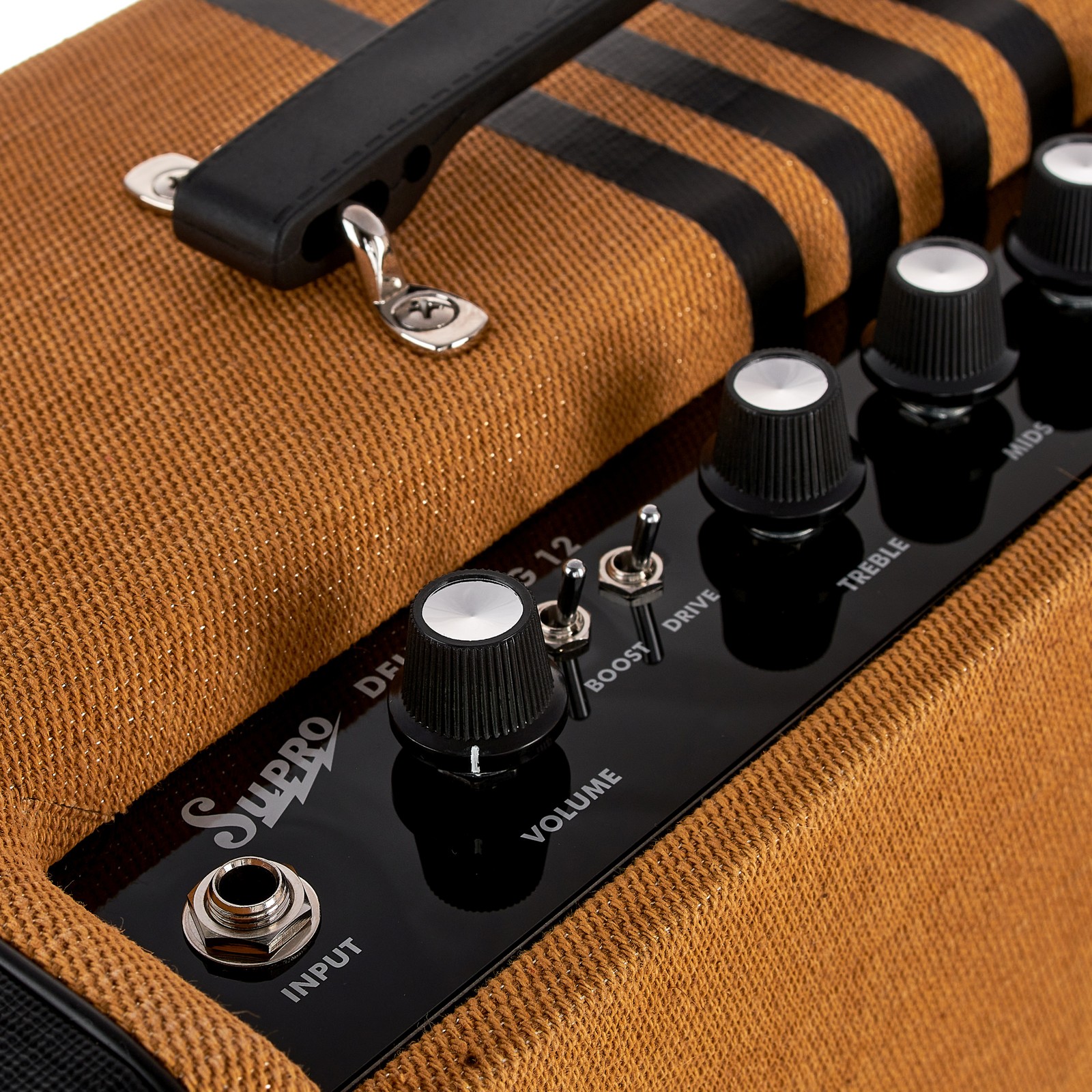 Mit seinem typisch britischen Soundcharakter empfiehlt sich der Supro Delta King 12 Combo besonders für Fans von klassischen Rocksounds, die ein Spektrum von warmen Cleansounds bis hin zu kräftigem Crunch benötigen und dabei eine lebendige Dynamik sowie einen Obertonreichtum zu schätzen wissen. Der kleine Combo bietet neben einer überraschend hohen Lautstärke aus seinem 12“ Supro DK-Speaker zudem auch eine hohe Flexibilität, die ihn für viele Live- oder Studio-Einsatzgebiete prädestiniert. Sie wird durch den Line-Out und die Power-Amp-In-Anschlüsse, die (auch per Fuß schaltbaren) Drive- und Boost-Effekte sowie den Vintage-Klang der Hallspirale gewährleistet.