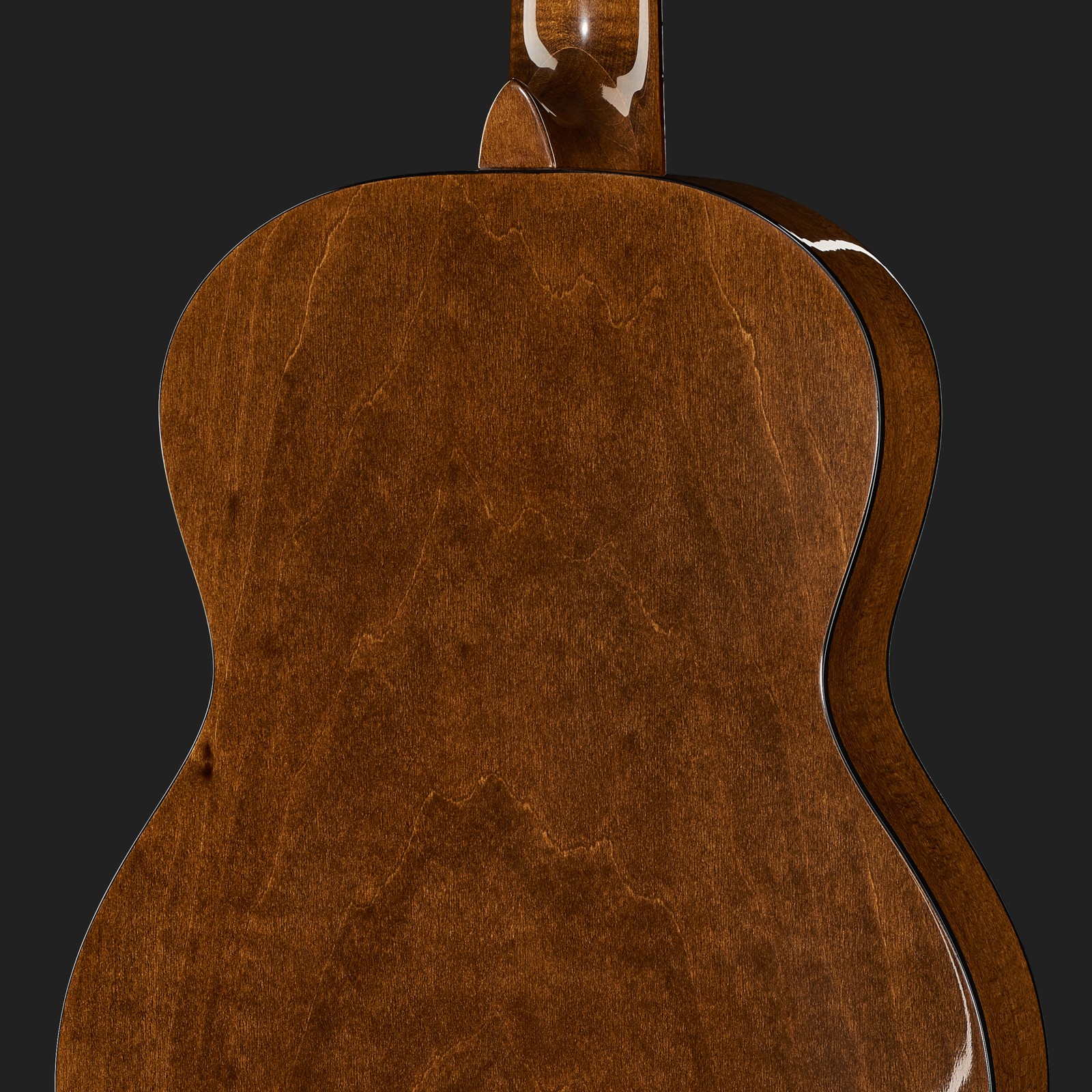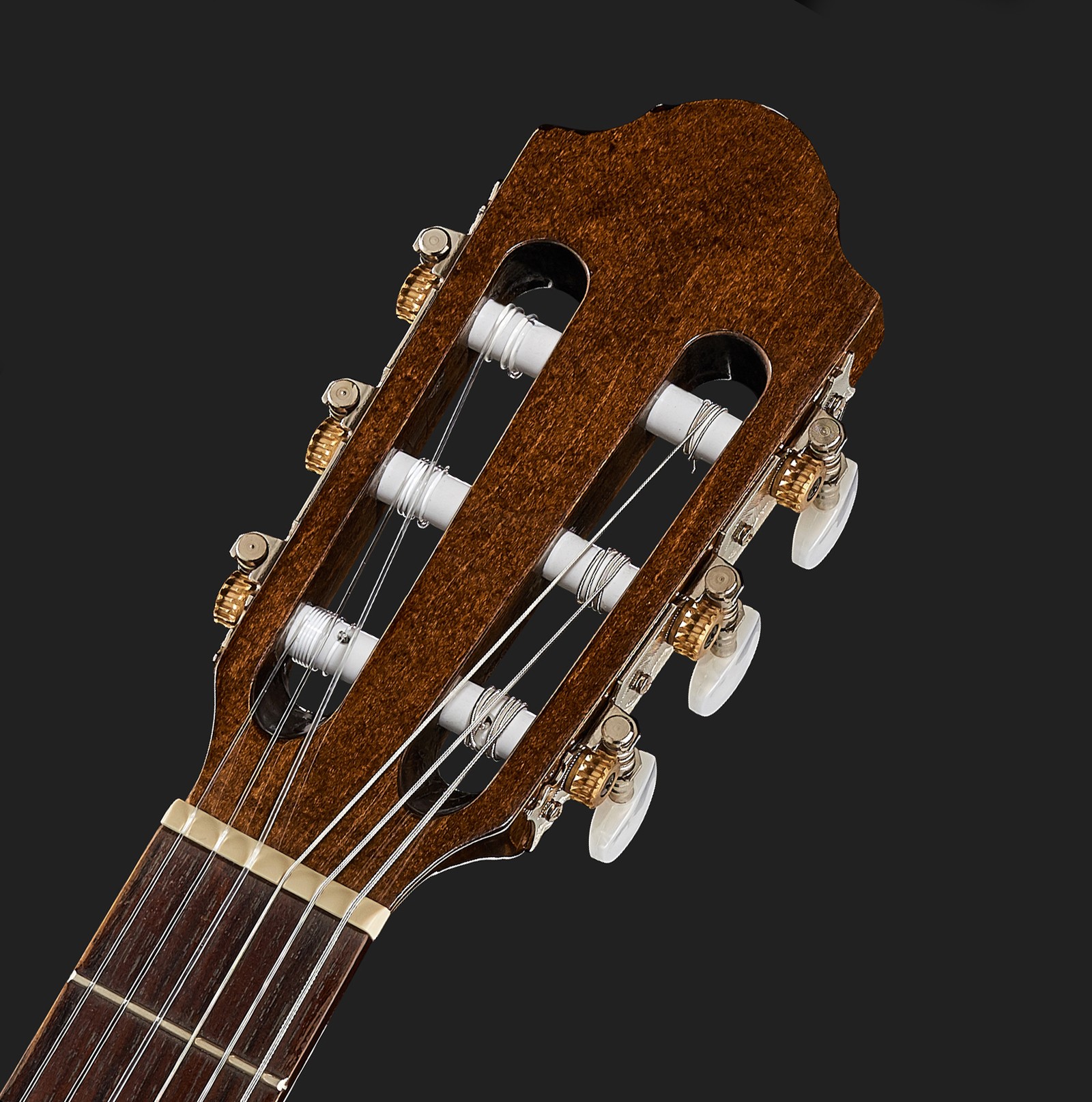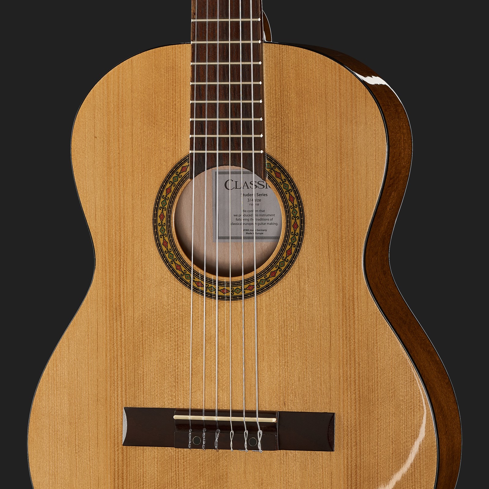 Die Thomann Classic 3/4 left ist eine Gitarre, die sich an die bewährte Vorlage hält. Der Korpus dieses in Europa gebauten Instruments besteht aus laminierter Buche, die Decke aus laminierter und getönter Fichte. Für den Hals wird Ahorn verbaut. Das Griffbrett ist mit 45 Millimetern schmaler als das einer normalen Klassikgitarre, und auch die Mensur fällt mit 57 Zentimetern deutlich kürzer aus. Vom Aufbau her ist sie somit eine typische Konzertgitarre für Linkshänder, nur rundum etwas kompakter gefertigt. Bauarttypisch kommt diese Gitarre ohne Gurtpins und ist somit für ein Spielen im Sitzen ausgelegt. Auch die wichtigsten Zubehörteile sind dabei: Tasche, Stimmgerät und Fußbank.