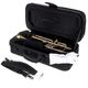 Der angenehmen Bespielbarkeit kommt die ML-Bohrung mit einem Durchmesser von 11,65 mm entgegen, die zusätzlich von dem Reversed Mundrohr unterstützt wird. Für die präsente Klangausbeute sorgt der einteilige Schallbecher mit einem Durchmesser von 125 mm. Ausgestattet ist die Bb-Trompete zudem mit leichtgängigen Monel-Ventilen, einem Ring am dritten Ventilzug und den beiden traditionellen Wasserklappen für das Ablassen der beim Spielen zwangsläufig entstehenden Feuchtigkeit. Ebenso erfreulich ist das umfangreiche Zubehör, das den niedrigen Preis nochmals erstaunlicher wirken lässt. Für den sicheren Transport zur Musikschule, zur Orchesterprobe oder zum Auftritt wird die Trompete im Light-Koffer mit Rucksacktrageriemen und formaussparendem Inlett geliefert. Ebenfalls mitgeliefert werden das Pflege-Öl, der weiße Handschuh und ein Mundstück. Alles dabei, damit es sofort losgehen kann.