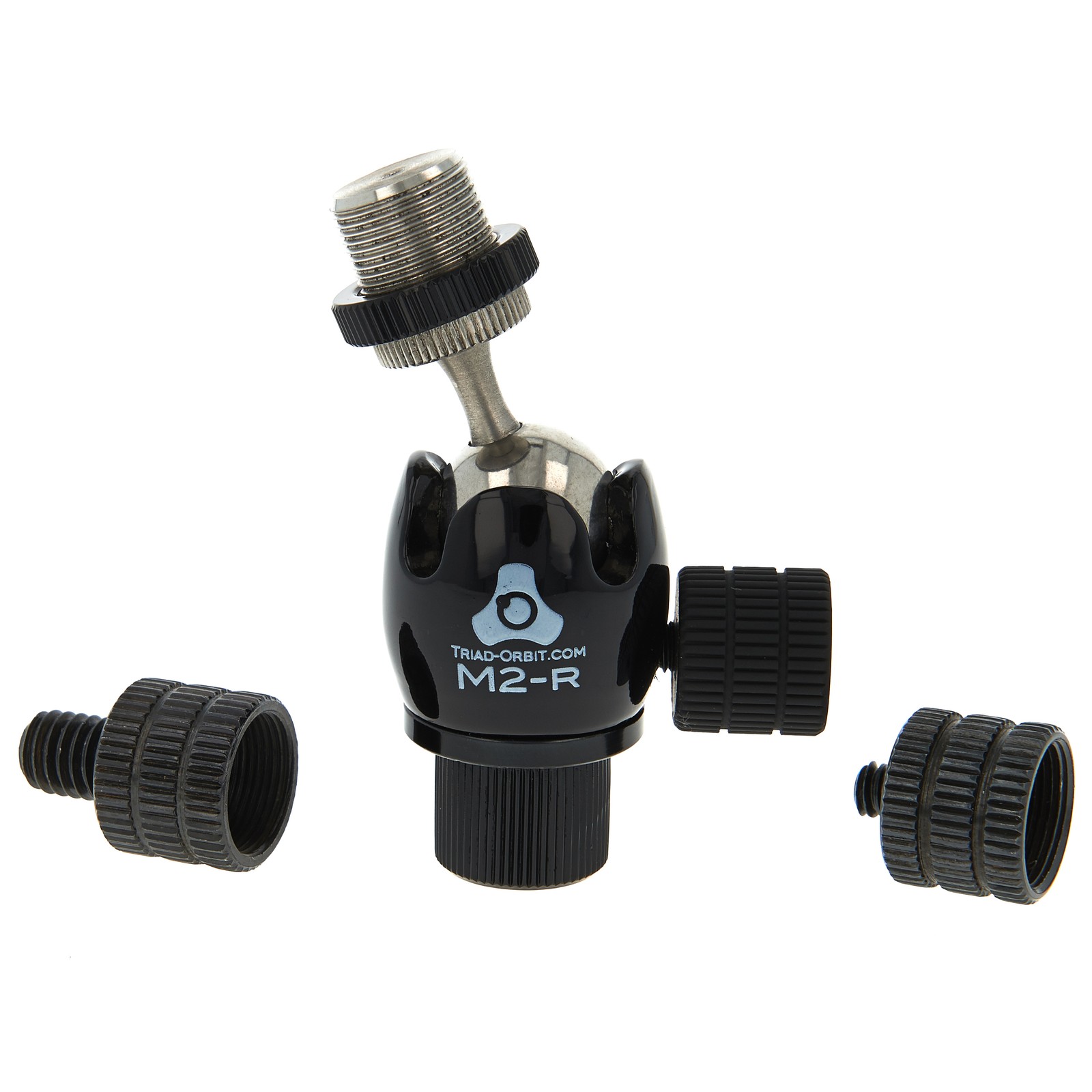 Der Adapter M2-R kann Mikrofone, Kameras und Scheinwerfer präzise per Kugeldrehgelenk ausrichten. Der M2 passt an herkömmliche Stative mit 5/8-Zoll- und 3/8-Zoll-Gewinde. Das mit einer Pulverbeschichtung in schwarzer Farbe überzogene Kugelgelenkgehäuse ist robust genug für Tourbetrieb und Dauereinsatz. Zwei Reduziergewinde-Adapter für die Befestigung von Mikrofonklemmen und -spinnen liegen dem Adapter gleich bei. Durch das um 360 Grad drehbare und 220 Grad schwenkbare Kugelgelenk, das per Arretierschraube festgestellt werden kann, lassen sich Mikrofone in nahezu jeder Position optimal justieren.